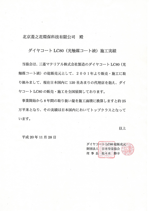 溫州泓創菱之花環??萍加邢薰臼侨毡救猊蕙匹辚ˉ?Dia Coat)光觸媒株式會社,(日本財團法人,日本勞榮協會)授權溫州市地區指定代理公司。